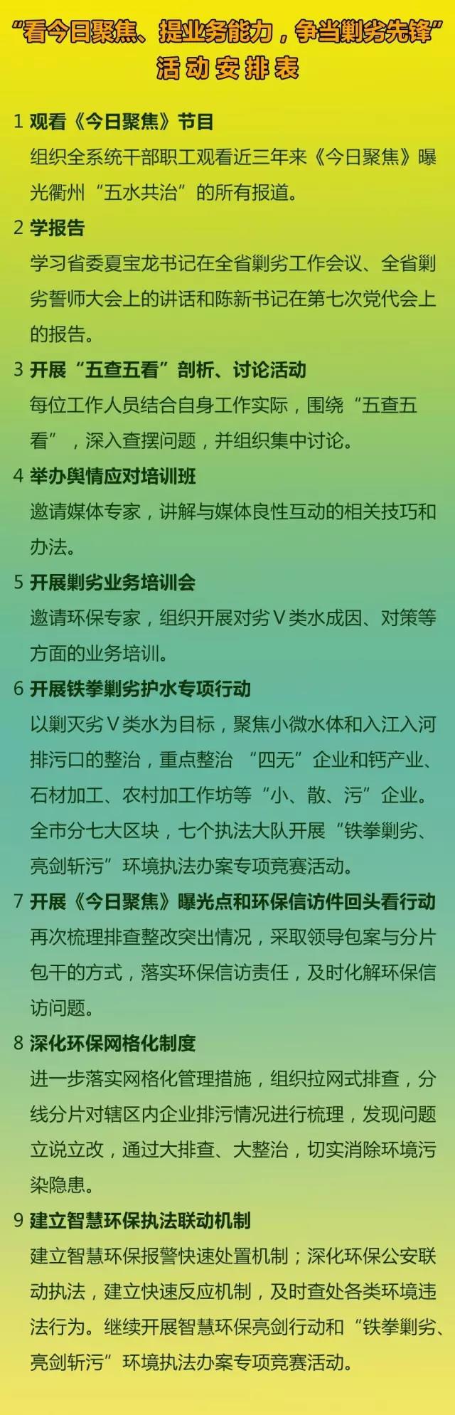 | 为认真贯彻落实全省剿灭劣五类水誓师大会和市第七次党代会精神,近日,市环保局开展“看今日聚焦、提业务能力,争当剿劣先锋”活动, 通过活动转变干部职工工作作风、提升业务能力,为全市域提前实现剿劣任务作贡献。 组织全局党员、执法人员观看近三年来《今日聚焦》曝光衢州市“五水共治”、环境保护方面的所有报道,开展“五查五看”,全面提升环保系统干部职工业务能力,争当剿劣先锋。“五查五看”即查信念,看忠诚;查执法,看公正;查纪律,看严明;四是查作风,看勤政;查工作,看成效。 从4月初开始,到11月底前结束,活动分三个阶段。 组织全局干部职工观看近三年来《今日聚焦》曝光衢州“五水共治”的所有报道;深入学习省委夏宝龙书记在全省剿劣工作会议、全省剿劣誓师大会上的讲话和陈新书记在第七次党代会上的报告;开展“五查五看”剖析、讨论活动。 |